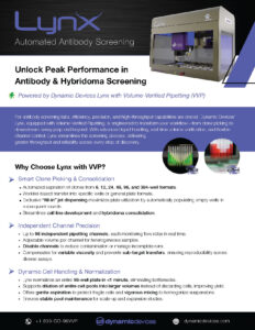 Automated Antibody ScreeningFebruary 9, 2026|By rchipp Unlock Peak Performance in Antibody & Hybridoma Screening Powered by Dynamic Devices Lynx with Volume-Verified Pipetting (VVP) Download Categories: Applications, Cellomics, Clone Selection & Expansion, Lynx PrevNext